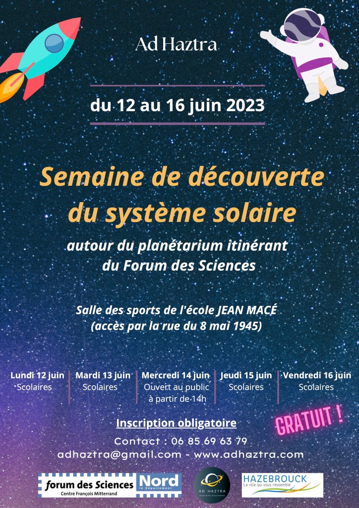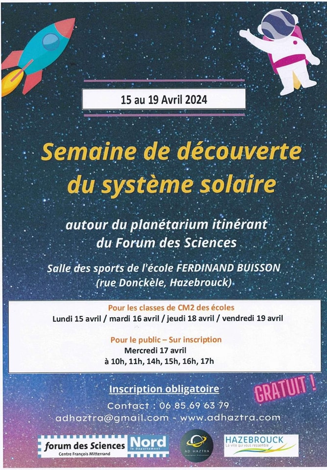 INSCRIVEZ-VOUS dès à présent auprès de l’association d’Astronomie AD HAZTRA qui organise la venue d’un planétarium sur HAZEBROUCK
