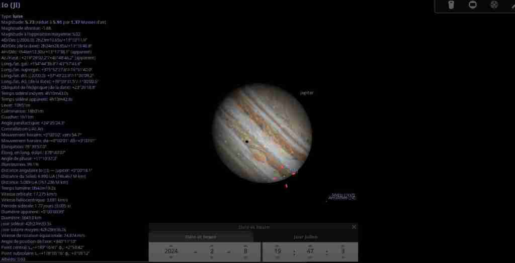 - La deuxième à 19h47 montre Io sur le bord de Jupiter et son ombre avance vers la tache rouge