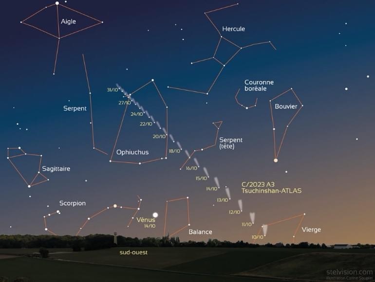 Voici en trois photos prises à l’aide Stellarium ce que vous auriez pu voir.