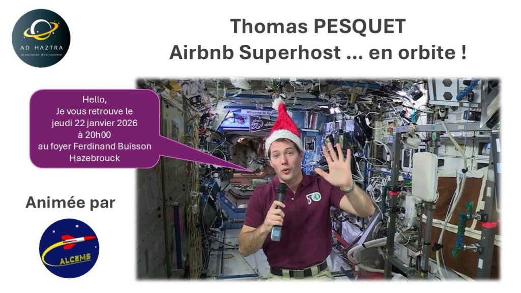 Nous vous confions à notre prochaine conférence, le jeudi 22 janvier à 20h au foyer F. Buisson rue Donckele à HAZBROUCK, conférence sur La Vie de Thomas PESQUET dans l’ISS, qui sera animée par M. Benjamin TALMAN, Président de l’association ALCEMS