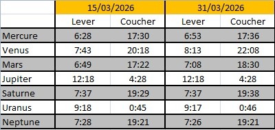 - 20 mars – la Lune près de Vénus : Le 20 mars, la Lune illuminée à 2 % sera proche de Vénus (mag -3,9) dans la constellation des Poissons. La distance entre les objets sera de 4°07′.