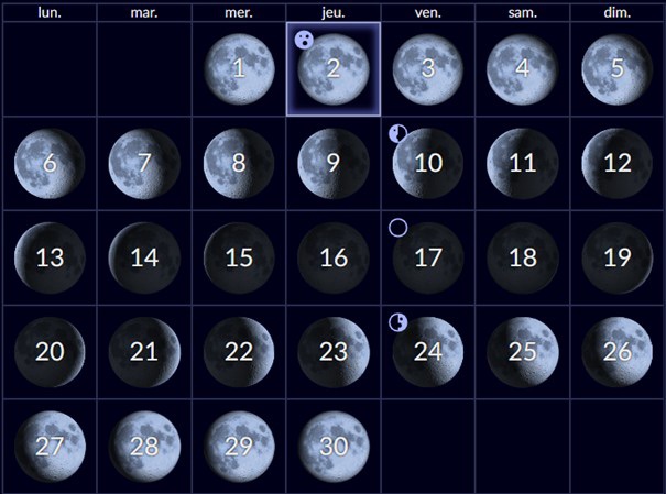 - 4 décembre – Pleine Lune, Super Lune : La Pleine Lune aura lieu le 4 décembre à 23:14. Cette Pleine Lune sera une « Super Lune ». Elle sera 7,9% plus grande et 15% plus lumineuse qu’une Pleine Lune ordinaire.
