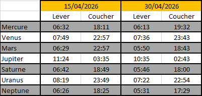 - 15 avril – la Lune près de Neptune : le 15 avril, la Lune illuminée à 4 % sera proche de Neptune (mag 7,8) dans le ciel. La distance entre les objets sera de 3°26′.